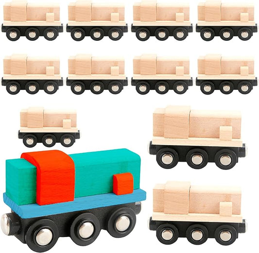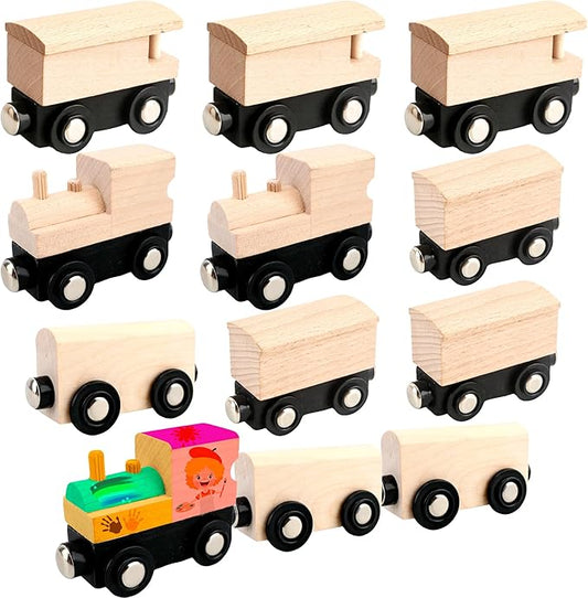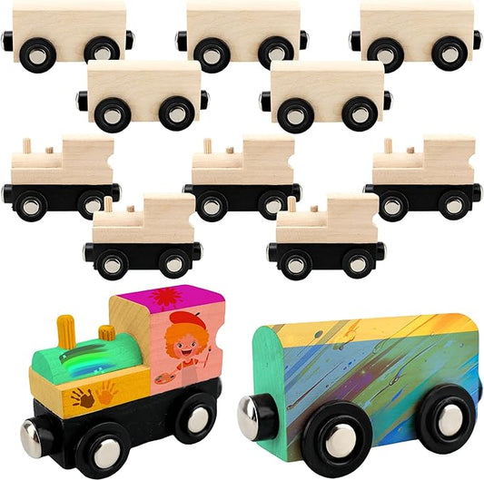12 Pcs Wooden Trains Toys Unpainted Wood Train Cars Weak Magnetic Suction Paintable Wooden Railway for Kids Educational Toys Birthday Christmas Party Gifts (Style Set 4)