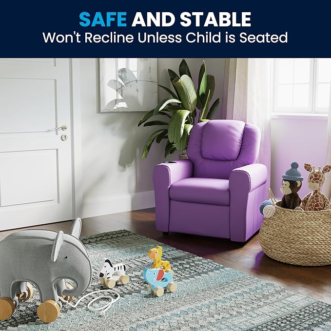 Flash Furniture Vana Vinyl Kids Recliner with Cup Holder, Headrest, and Safety Recline, Contemporary Reclining Chair for Kids, Supports up to 90 lbs., Lavender