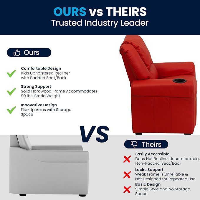 Flash Furniture Vana Vinyl Kids Recliner with Cup Holder, Headrest, and Safety Recline, Contemporary Reclining Chair for Kids, Supports up to 90 lbs., Red