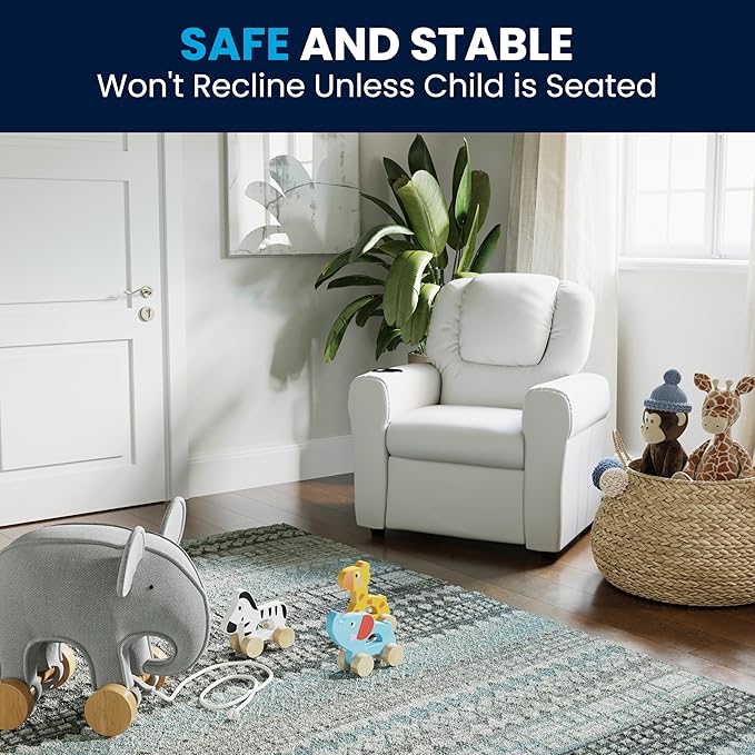 Flash Furniture Vana Vinyl Kids Recliner with Cup Holder, Headrest, and Safety Recline, Contemporary Reclining Chair for Kids, Supports up to 90 lbs., White