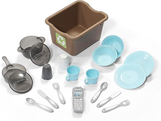 • INTERACTIVE TOYS: Realistic lights and sounds, 20-piece toy kitchen play set, enhance playtime with pots, pans, silverware, storage bin, phone, (food and batteries not included)