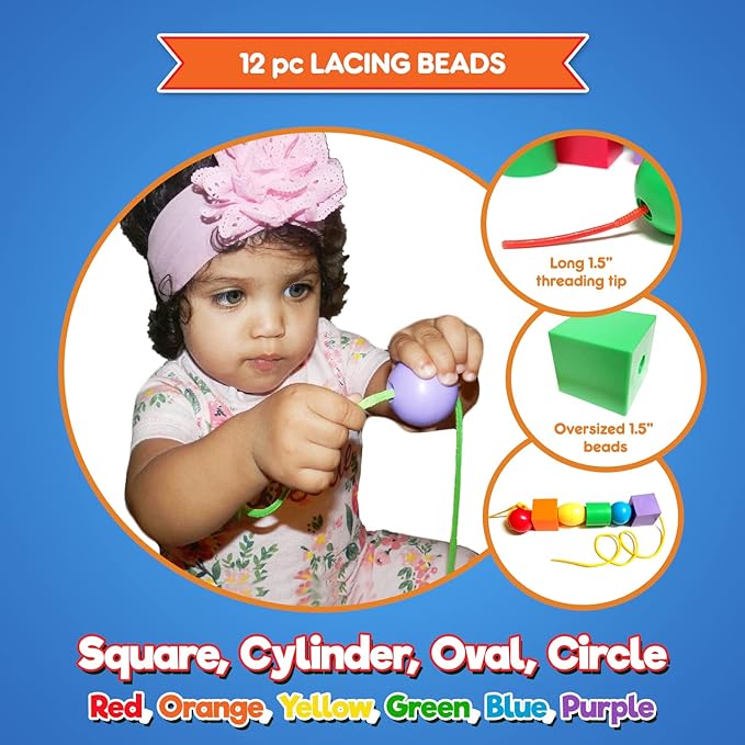 - PRIMARY LACING BEADS | The jumbo beads can be used creatively as your little one designs bracelets and necklaces. Using different colors and shapes, this set allows for the mind to freely explore creativity. Challenge your child by asking them to design only with 1 color or only 1 shape. Increase the difficulty as they grow to encourage your little one to keep uncovering new ways to lace.