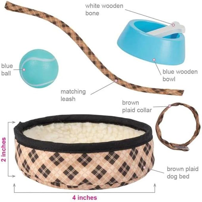 - 7-Piece Set includes a cute brown dog, soft brown plaid dog bed, brown plaid collar, matching leash, blue ball, blue wooden bowl and white wooden bone.