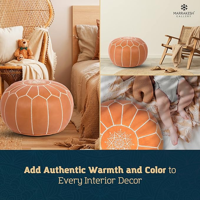 - Handcrafted by Artisans in Marrakesh - Made from 100% genuine soft leather, this Round Leather Cover pouf ottoman features exquisitely detailed, hand-stitched embroidery with a unique design down to the finest details