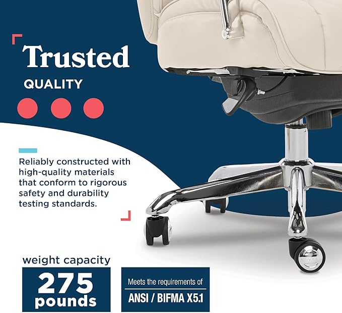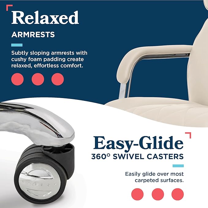 La-Z-Boy Sutherland Quilted Leather Executive Office Chair with Padded Arms, High Back Ergonomic Desk Chair with Lumbar Support, Ivory White Bonded Leather