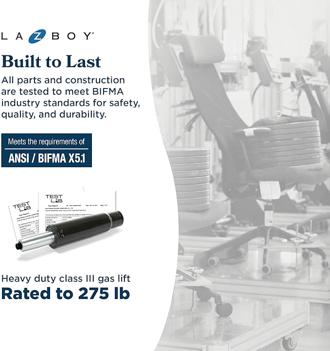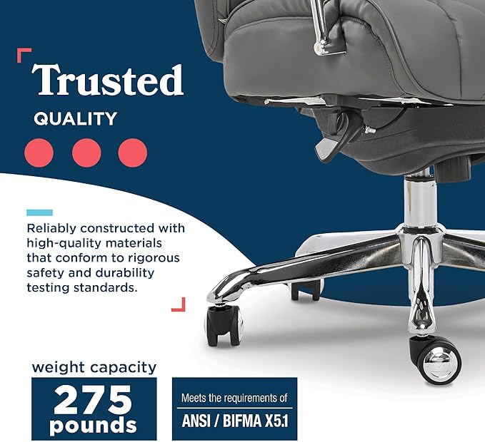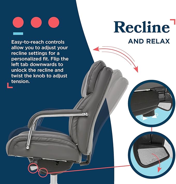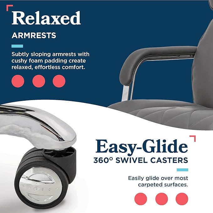 La-Z-Boy Sutherland Quilted Leather Executive Office Chair with Padded Arms, High Back Ergonomic Desk Chair with Lumbar Support, Grey Bonded Leather