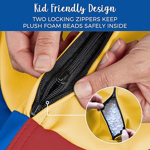 - BUILT TO LAST — features double-stitched seams for added durability, two safety zippers that prevent children accessing beads and soft leather-like material that easy to wipe clean after use