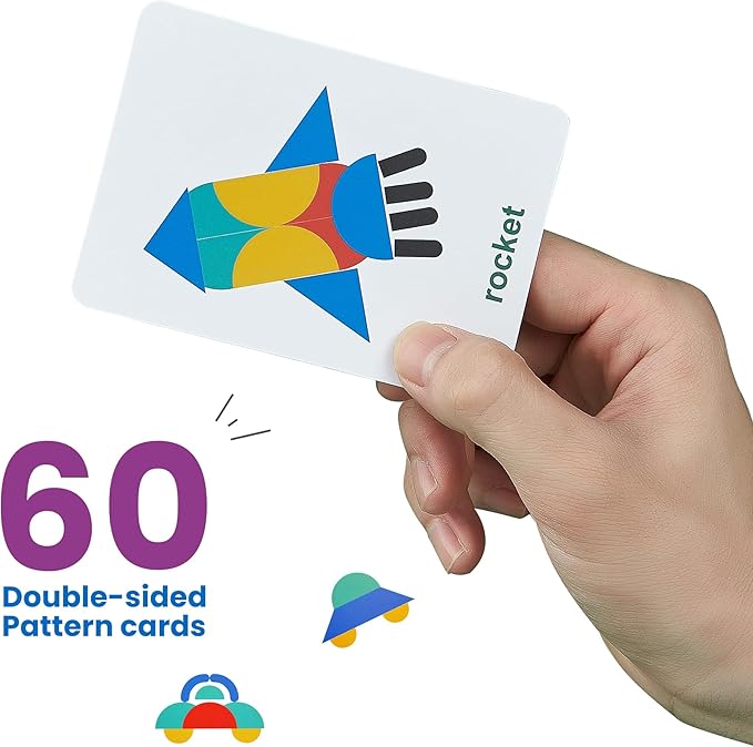 - Contains 36 wooden shape pieces, 60 pattern cards and 2 iron tins for storing the pieces