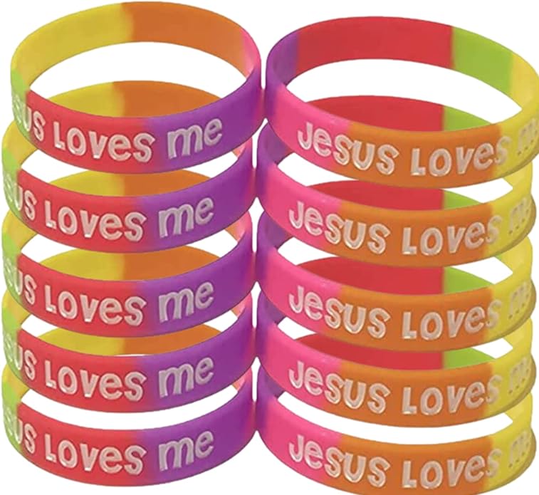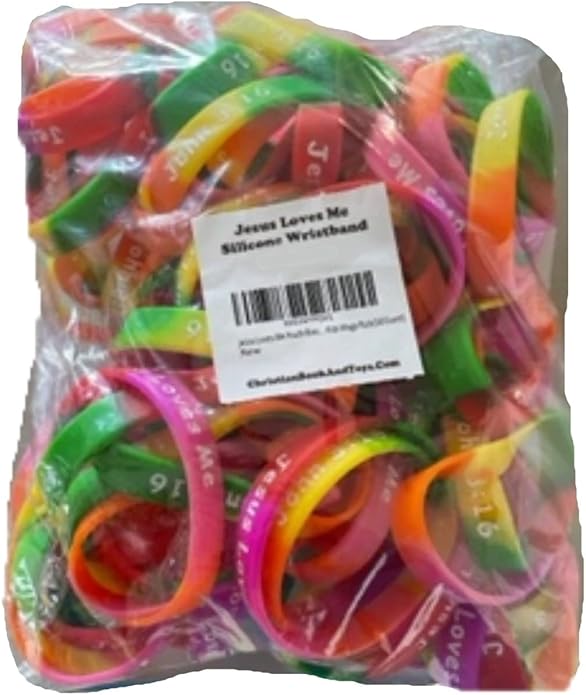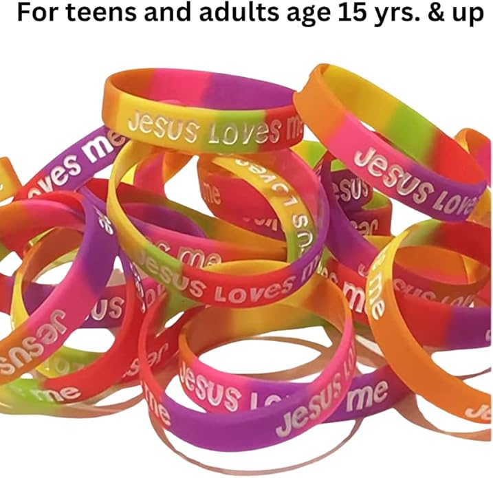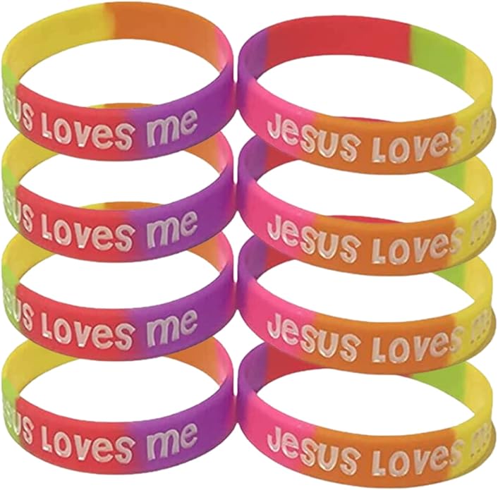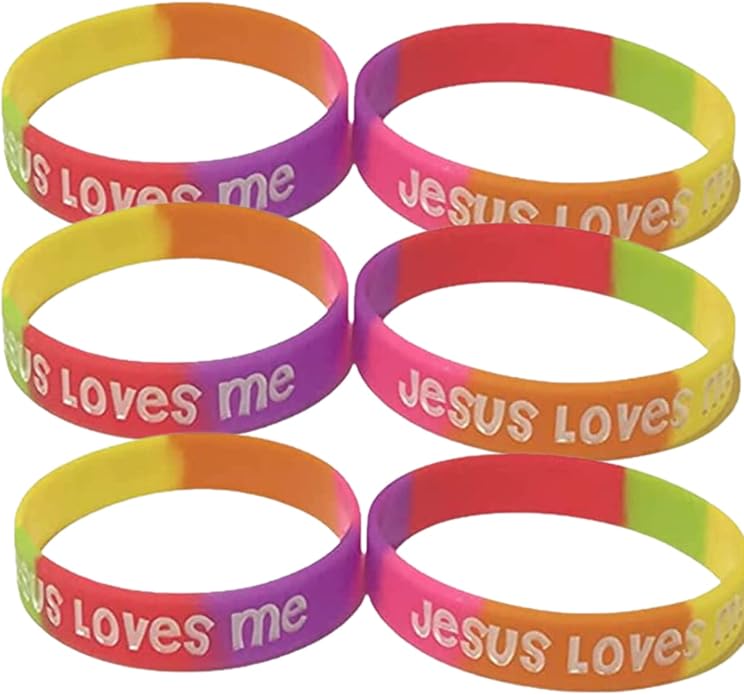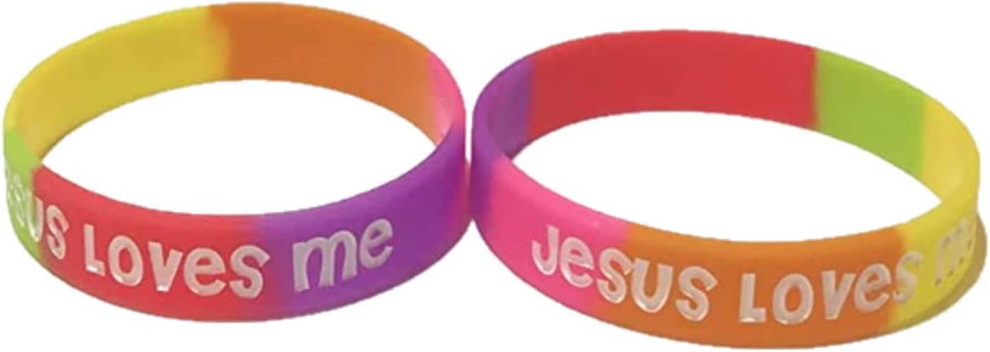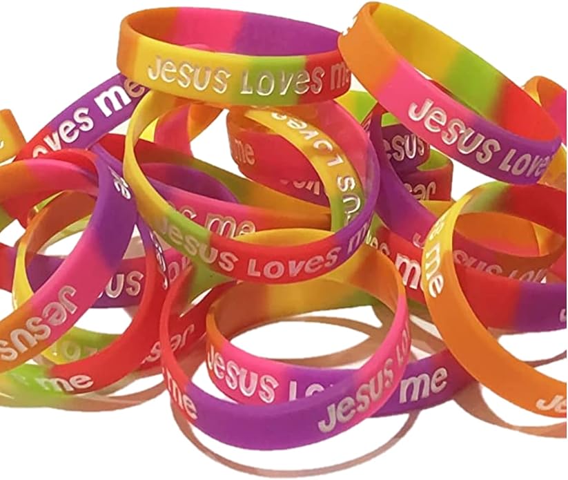 - For Small Wrists. Get 100 count of Jesus loves me youth Christian silicone rubber bracelets in bright and beautiful colors including purple, yellow, orange, pink, green, and red. These top-quality bracelets are thick and not flimsy like other brands, and are ink injected to ensure that the letters won't wear off over time. Use them for Vacation Bible School (VBS), church camp, Sunday school, field trip identification. They are 7" in size, and make great prizes and giveaways.