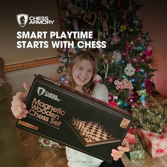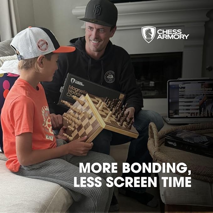 15 Inch Magnetic Wooden Chess Set for Adults & Kids - Folding Travel Chess Board with Handcrafted Staunton Pieces, Extra Queens, and Storage Slots