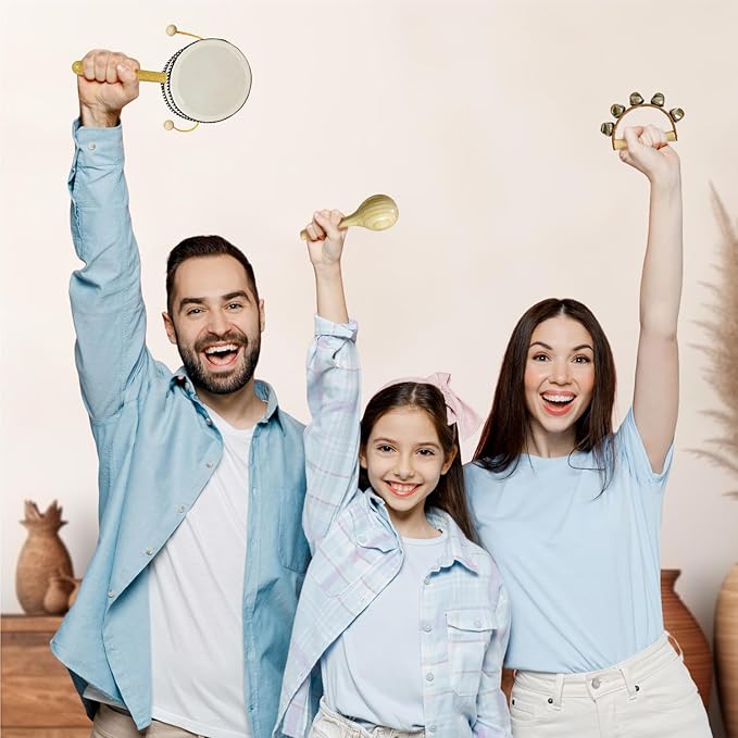- Inspire budding musicians: featuring 1 tambourine, 1 castanet, 1 hand drum, 2 hand bells, 1 maracas, 1 flute, 1 wooden block with stick, 1 wood sounder with stick and 1 chime bar with stick, our baby musical toys are a way to introduce kids to music
