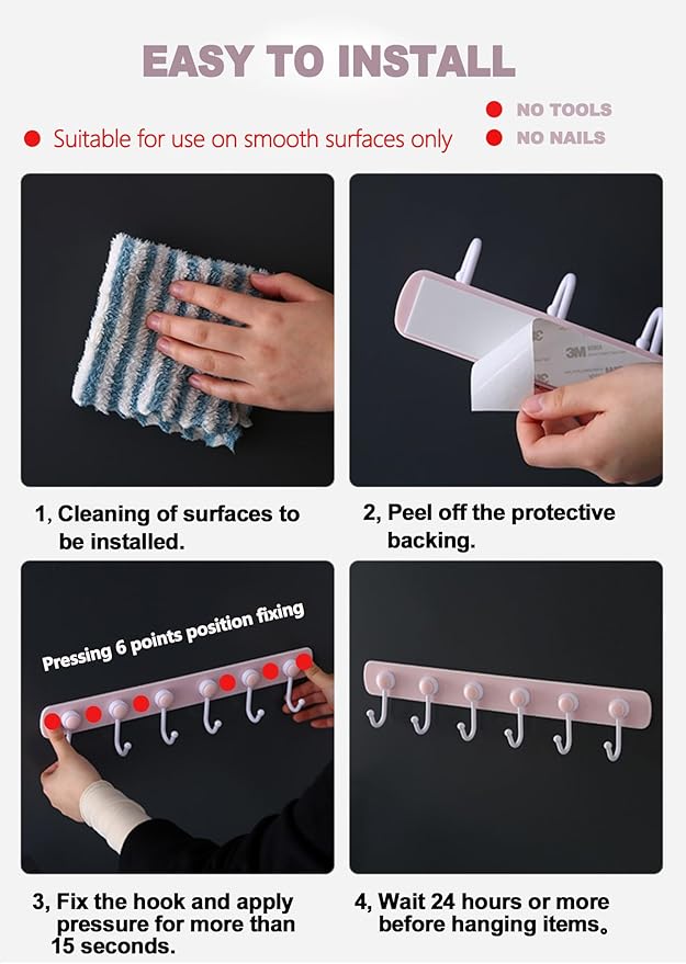 - ◆ Innovative Design: Effortless installation and usage with NO TOOLS, NO SCREWS, and NO HOLES required. Features 6 hooks with 360-degree rotation for customizable placement. Ideal for use in the kitchen, bedroom, foyer, hallway, or office, maximizing space-saving potential