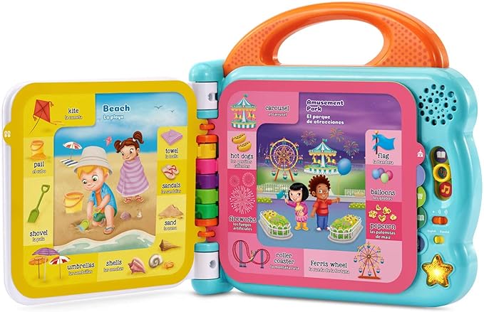 - The light-up star music button plays two bilingual learning songs; use the carrying handle to bring the book on the go