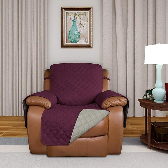 PureFit Reversible Quilted Sofa Cover, Water Resistant Slipcover Furniture Protector, Washable Couch Cover with Non Slip and Elastic Straps for Kids, Dogs, Pets (Oversized Recliner, Wine/Beige)