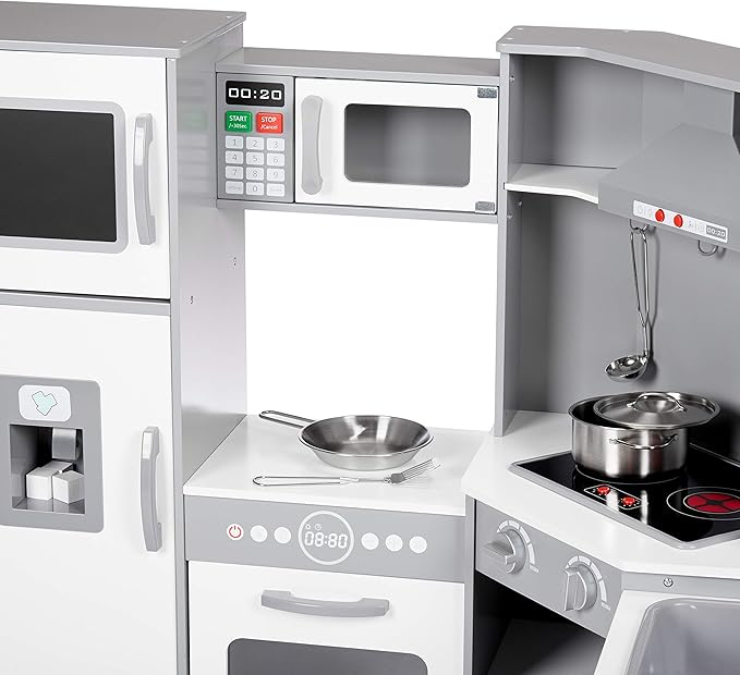 Amazon Basics Kids Corner Wooden Kitchen Toy Playset with Stove, Oven, Sink, Fridge and Accessories, for Toddlers, Preschoolers, Children Age 3+ Years, White & Gray, 39.37"L x 28.35"W x 35.04"H