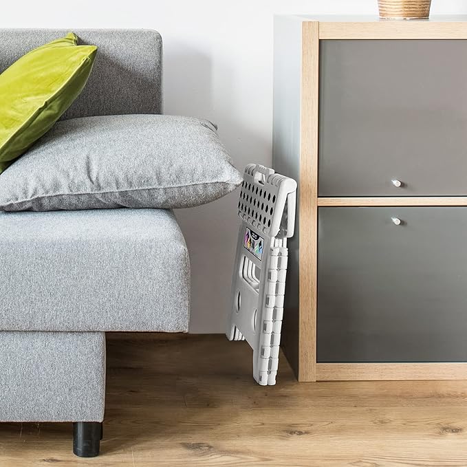 - Space Save Fold Up Step Stool : It folded up only with 1.2" wide so that you can storage this plastic collapsible step stool to any narrow gap in kitchen,bathroom,rv