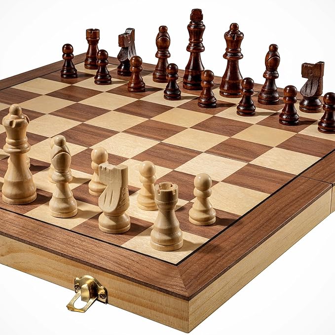 - Foldable and Easy to Store - The wooden board folds up and the pieces can be held inside the box when closed and are held in place tightly by foam insert. This is great when you don't have room to leave the chess board out all the time. Easily fit it in a backpack as travel game.