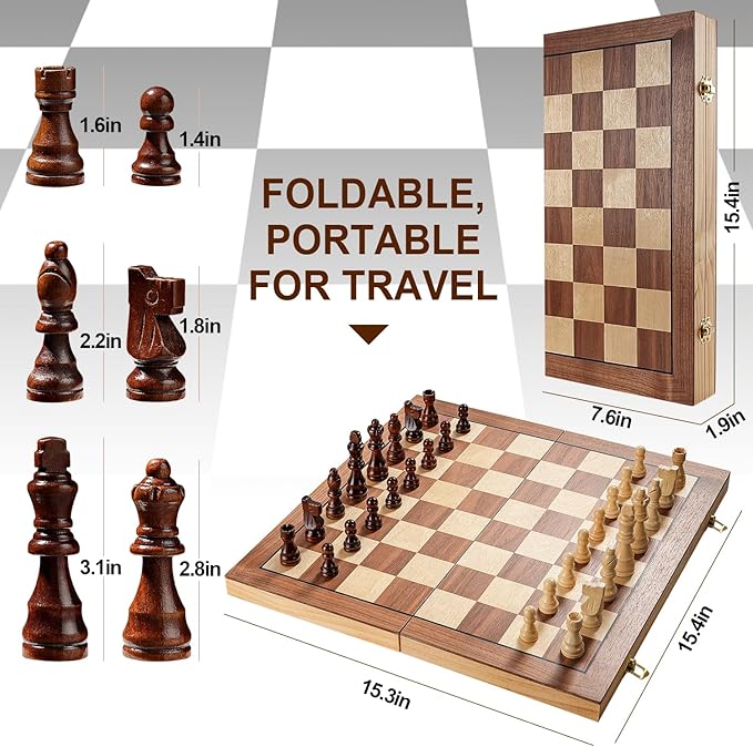 Magnetic Chess Board Set for Adults & Kids, 15" Wooden Folding Chess Boards, Handcrafted Portable Travel Chess Game with Pieces Storage Slots