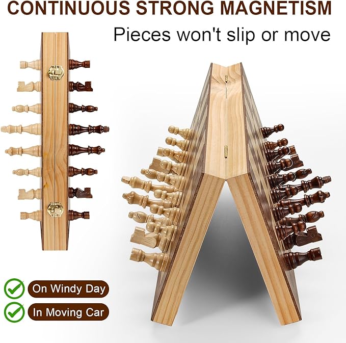 - Strong Magnetic Chess Set - Chess pieces won't tip over, even hold to the board when turned upside down, since there are magnets on the surface of the whole board and the bottom of the pieces.