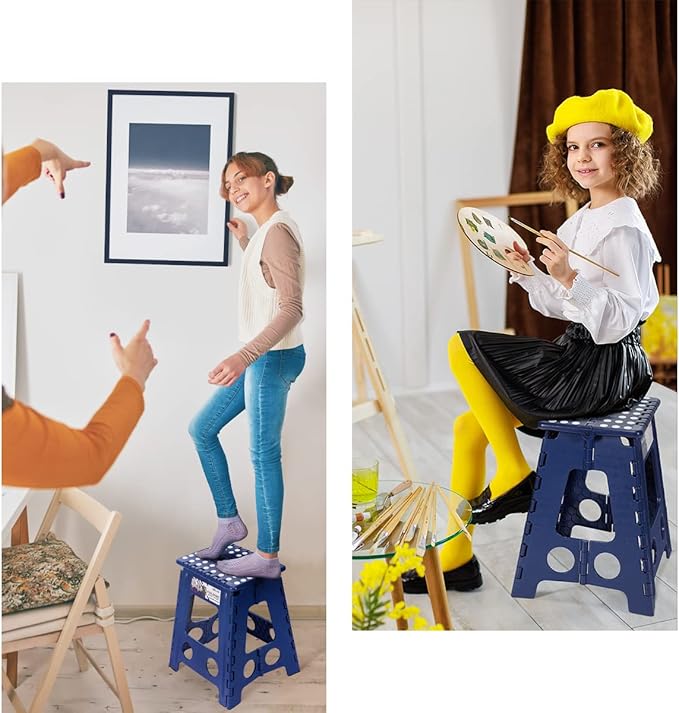 - Sturdy Folding Stool : The internal structural design 16 inch Folding Stool in Royal Blue is unique makes the step stool extra strong and safe. It can hold up to 400 lbs Max !!! Which is mainly used for adults indoor sitting. Please make sure the step stool is fully opened before use