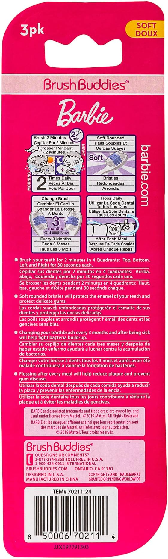 - [What's Included] The Brush Buddies Hot Wheels Toothbrush Pack includes 3 multi-colored Barbie kid's toothbrushes.