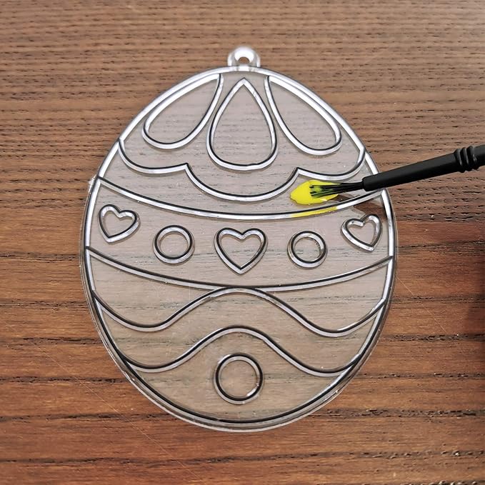 - Size: Each egg suncatcher measures about 4.5" long, perfect size for kids' little hands, and the finished works will look wonderful hanging in the windows, trees, or doors as ornaments. Acrylic beads are about 0.4" in diameter. Each bottle of suncatcher paint is 0.2 fl oz/6ml in capacity. Each mini empty paint pot holds 0.06 fl oz /2ml of paint. The fishing thread is about 787" in length. Each suction hook is about 1.6" in diameter.