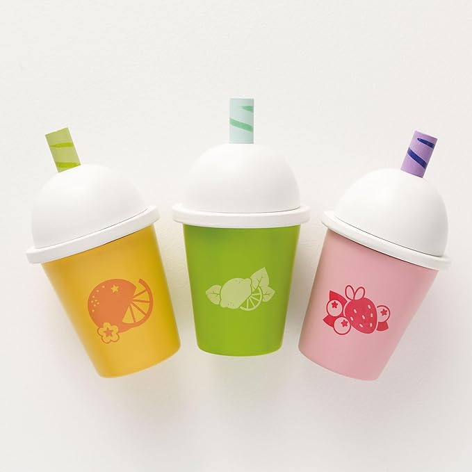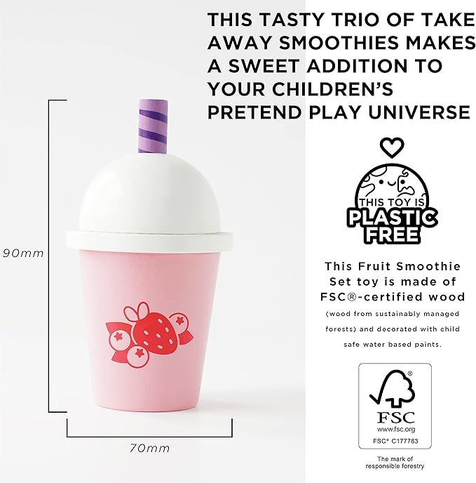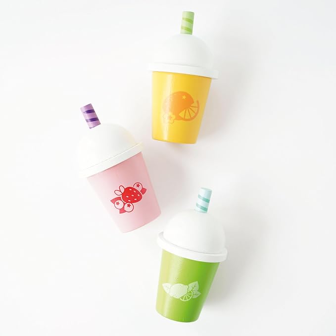 - PLAY FOOD: This wooden trio take away smoothie 3 piece set with straws allows your little one to role play. These gender neutral toddler toys are great learning resources. Mix and match with shopping and market sets for extensive imaginative kids toys