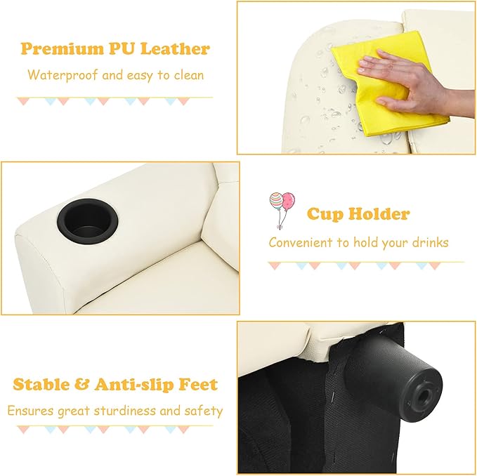 Costzon Kids Recliner Chair with Cup Holder, Toddler Furniture Children Armrest Sofa w/Headrest & Footrest for Girls Boys Baby Bedroom, Kids Room, PU Leather Kids Recliner Couch (Beige)