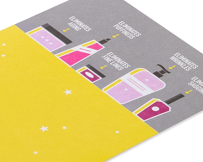 - This birthday greeting card for her features a bright yellow starry background and cosmetic products with swirl designs and raised detailing on quality cardstock