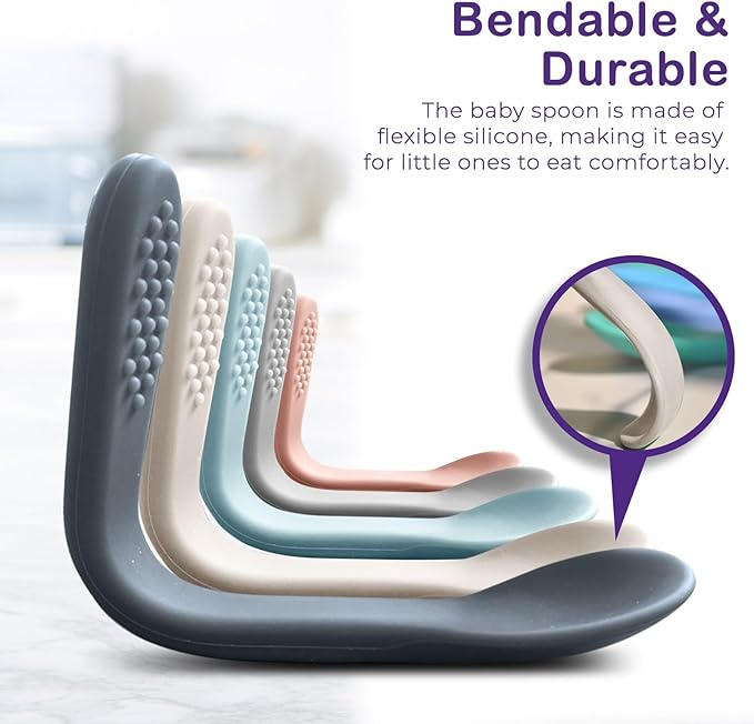 - Silicone Baby Spoons First Stage Pack of 5 - As your baby is transitioning to solids, these silicone spoons baby will aid in developing their skill of self-feeding and at the same time sharpening their motor skills, the silicone baby spoon is designed with those tiny hands in mind, so it should be easy to grasp and soft to touch. Choose these Silicone Baby Spoons self feeding 6 months to empower your baby's developmental milestones with confidence and comfort.