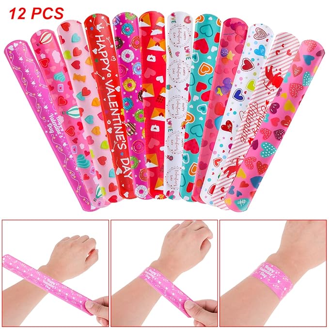 - 【12 colorful valentines slap bracelets】12 valentine's day slap bracelets for kids in 12 different styles, one size fits all 1.2 x 9.05 inch (3x23 cm), friendship bracelets in a romantic red pink color series and printed with different valentine's day elements of happy valentine's day,heart,balloon,angle,love,wave dot,bow,candy,envelope, donuts etc, kids will love them, great fun for valentines day decorations.