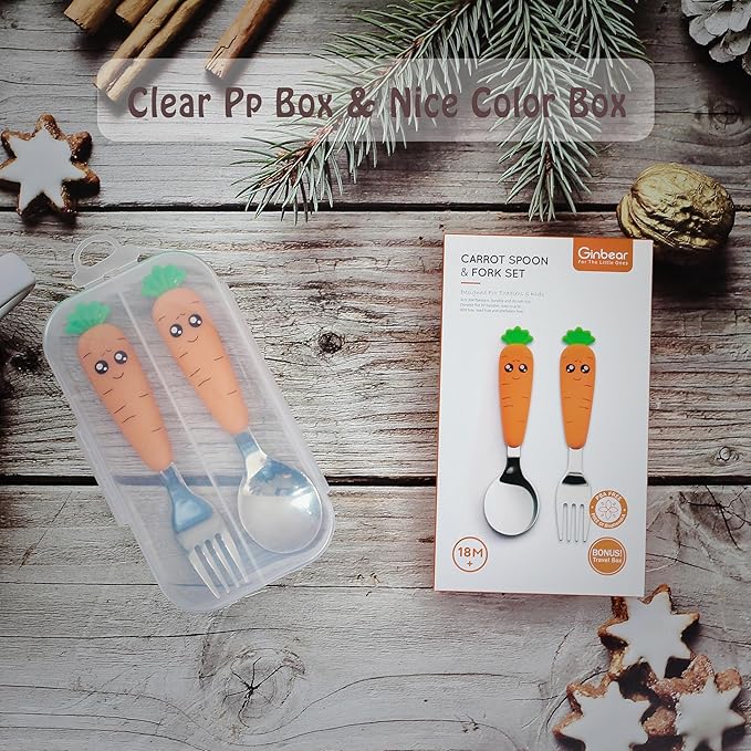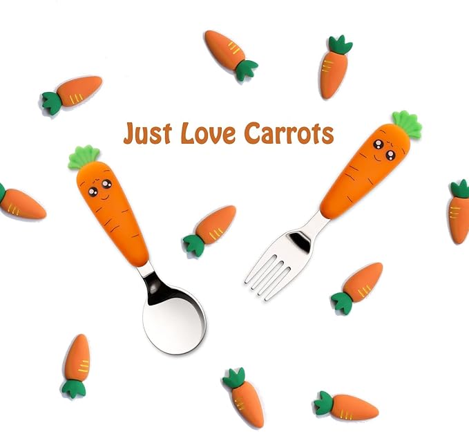 - TODDLERS THROUGH KIDS TO USE – The flat carrot spoon and fork handles have a good size for a child to grip, and allows the toddler to pick up food properly. It fits for the toddler & kids from 18 to 72 months. We believe our cute fork and spoon set will be one of the baby flatware sets that your family will have for years.