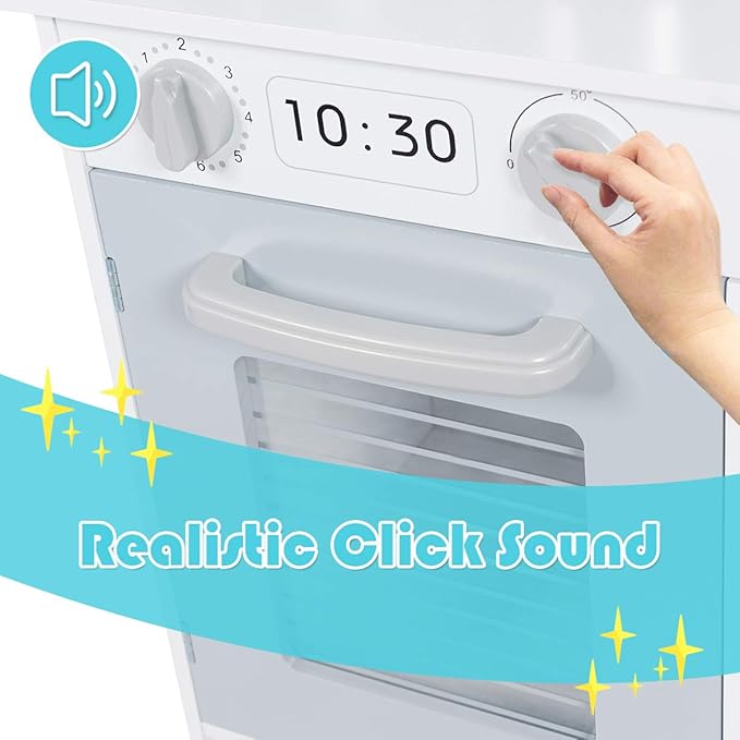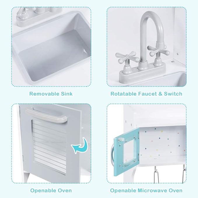 - 🍽️【Quality & Child-friendly Material】: Made of premium child-friendly MDF that has passed ASTM certification, this kids kitchen is odor-free and durable for long time use. And the solid wood legs provide strong support, preventing suddenly turnover, which is safer for your kids to use.
