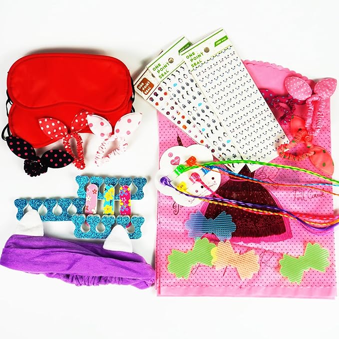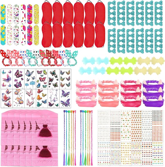 - Package included: 12 x Mini nail files bulks, 12 x toe separators, 12 x butterfly tattoo stickers(random pattern), 12 x mixed nail art stickers(random pattern), 12 x eye masks, 12 x bags, 12 x Colored Hair Clip Braids, 12 x hair rings(random pattern), 12 x crown shaped hair pads(random pattern), 12 x hair headbands. The specific dimensions are shown in the drawing.