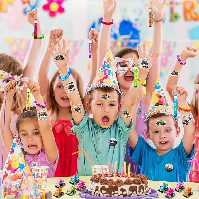 - What You Get: Monster truck cars*12,monster truck stickers*50,monster truck keychain*12,Monster truck bracelet 6 types *2,monster truck badge*12,monster truck face stickers*12