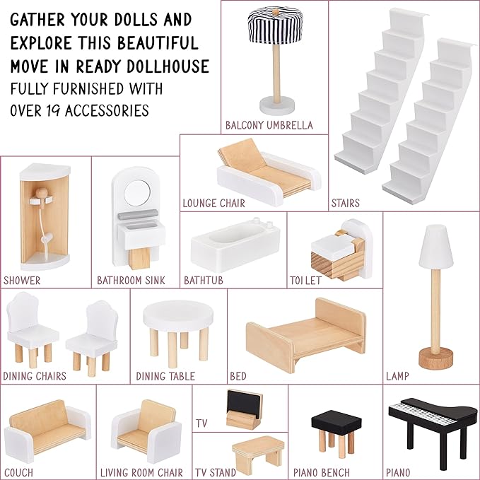 - DOLLHOUSE FURNITURE SET INCLUDED | Highly Realistic, Meticulously Decorated & Fully Immersive, Our Imaginative Play Set Has Little Ones Playing Straight Out the Box with 17 Lifelike Accessories: Living Room Sofa, Lamp, Kitchen Table, Chairs, Bathtub, Toilet, Piano, Bench, Patio Umbrella, Bed & Bedroom Nightstand | Rooms are Also Covered in Colorful, Detailed Wallpaper for Gorgeous Aesthetic