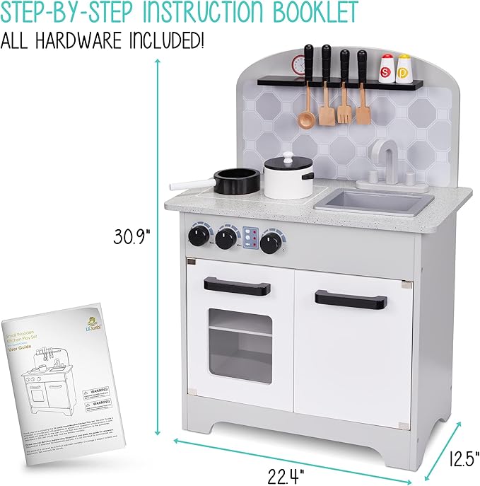 Lil' Jumbl Kids Pretend Kitchen Playset, Pretend Wooden Play Kitchen Toy, Realistic Setup, Includes Pot & Pan, 4 Utensils, Salt & Pepper Shaker, Gray