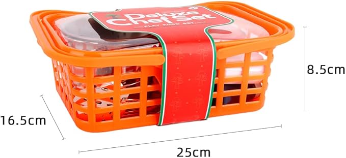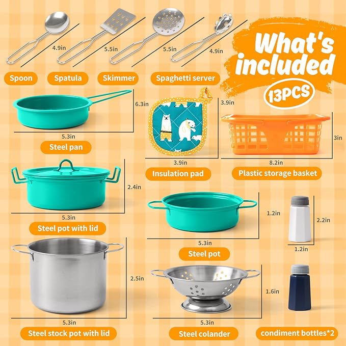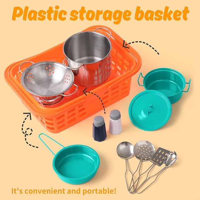 - 🌈【 Kids Play Kitchen Accessories 】— 14PCS set includes: One colander, one stockpot, one pan and one low pot, comes with one covers, one spatula, one ladle, one draining spoon, one spaghetti server, one table mat and 2 spice bottles. There is also a carrying basket to store all the kitchen utensils.