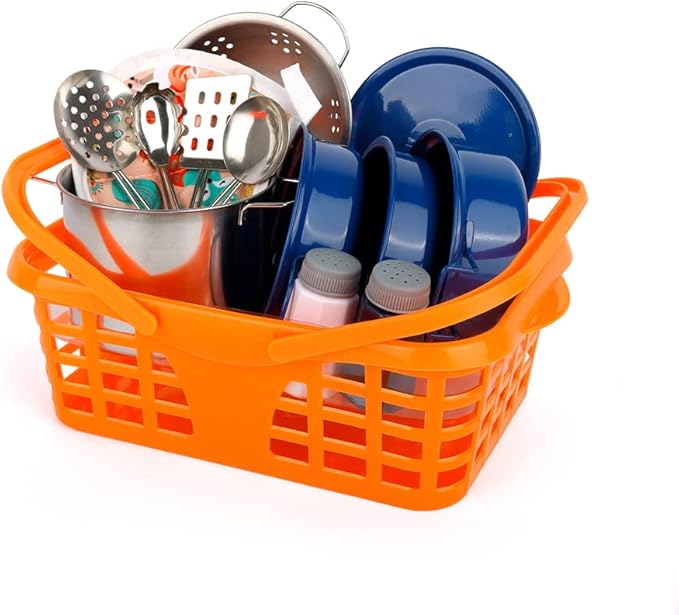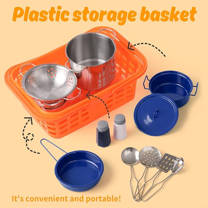 - 🌈【 Kids Play Kitchen Accessories 】— 14PCS set includes: One colander, one stockpot, one pan and one low pot, comes with one covers, one spatula, one ladle, one draining spoon, one spaghetti server, one table mat and 2 spice bottles. There is also a carrying basket to store all the kitchen utensils.
