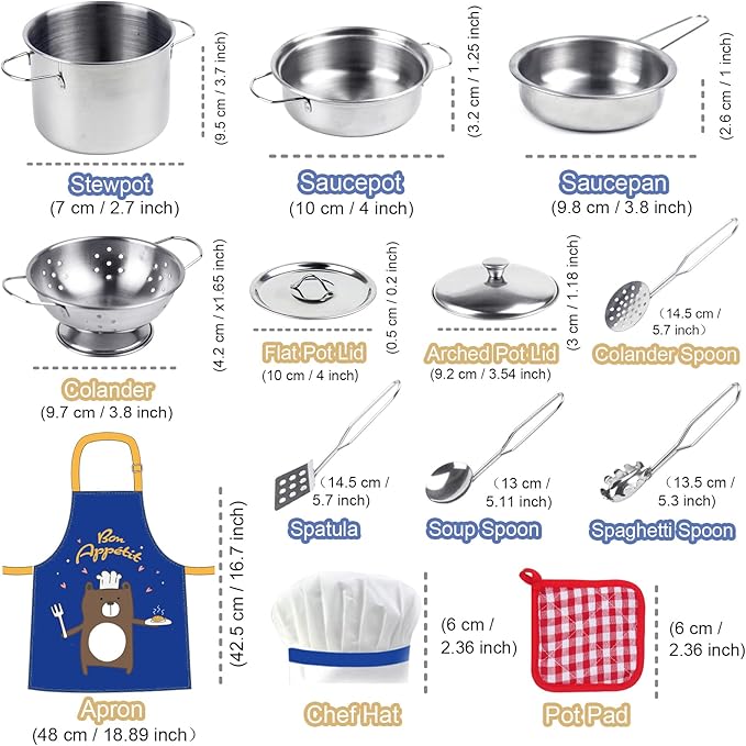 - Pretend Play Food for Toddlers: The pots and pans playset includes stainless steel cookware utensils, wooden cutting board and knife, a kitchen apron and chef hat, onion, corn, cucumber, carrot, tomato, mushroom and a storage bag