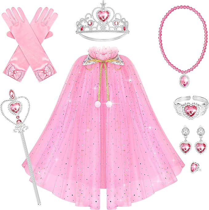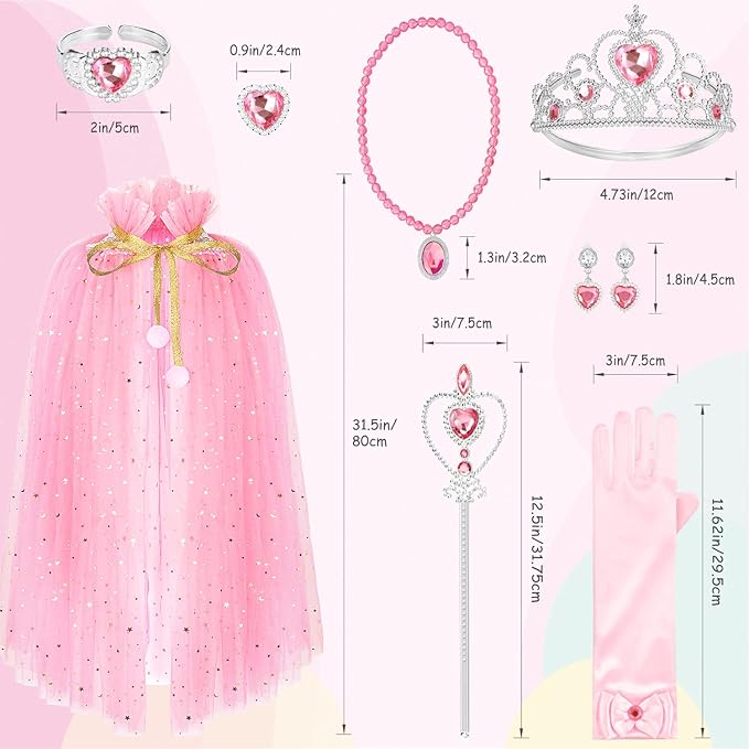 - Princess Dress Up Set: Come with princess cape, princess crown tiara, princess magic wand, princess gloves, bracelet, ring, necklace, clip-on earrings. Rich dress up accessories for your little girls.
