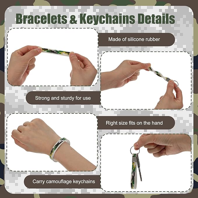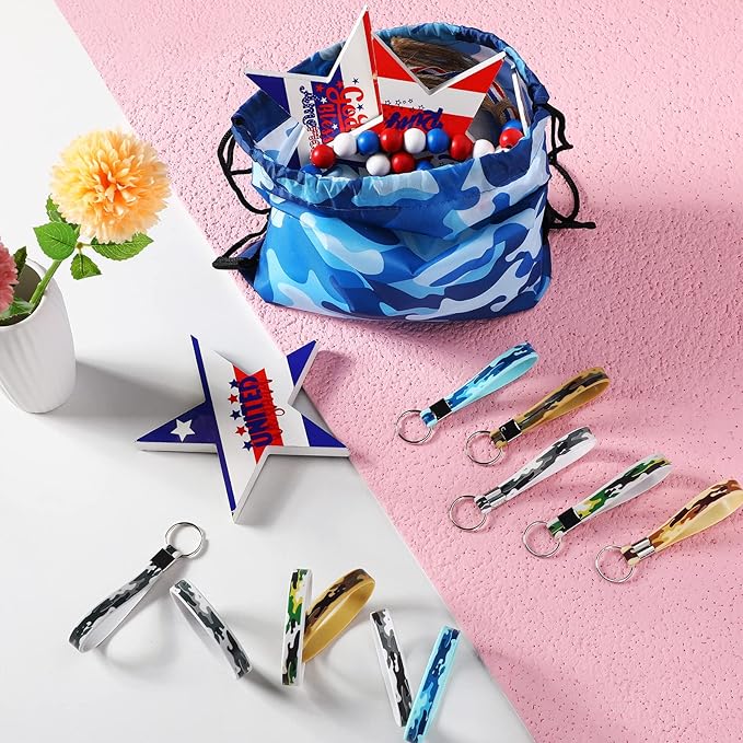 - Package Contains: you will receive 36 pieces camouflage party kits, including 12 pieces camo drawstring backpacks, 12 pieces camouflage army rubber bracelets and 12 pieces silicone camouflage keychains, multiple colors and different patterns designed to make you stand out from the crowd, sufficient quantity to meet your replacement needs, and you can also share with your family and friends