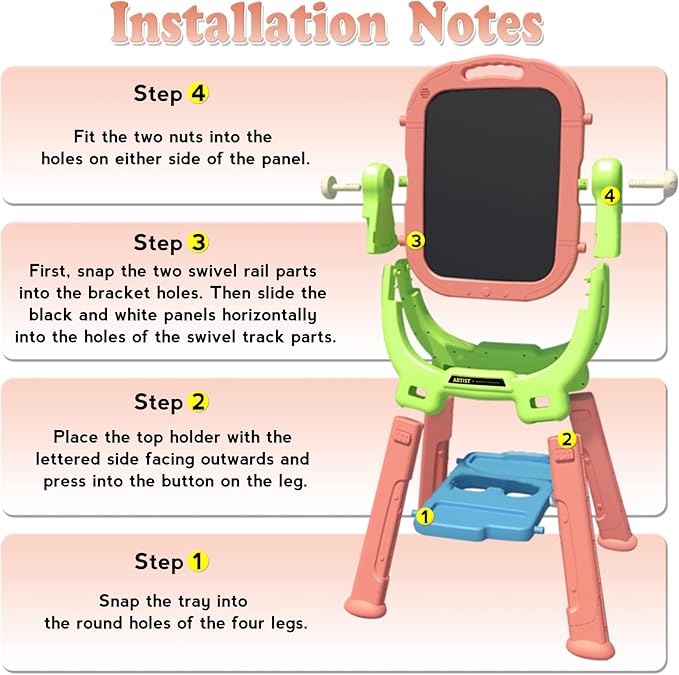 - 🖍 Easy to Assemble: This kids easel made of high-quality ABS plastic, has been awarded by CPC certification. Detailed installation instructions are provided on the package and the installation steps are simplified to reduce frustration during installation. The tray can be added to the water so that the triangular stand makes the drawing board more stable.