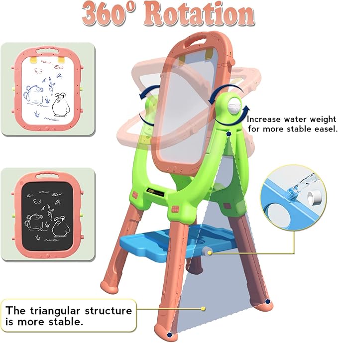 - 🎨3 in 1 Kids Easel: 360° Rotating & Height Adjustable & Double-sided magnetic drawing board has a chalk board on 1 side and a dry erase board for kids on the other. Equipped with multiple painting tools, art kit has upgraded magnetic letters & numbers, colorful chalks,watercolours and more.