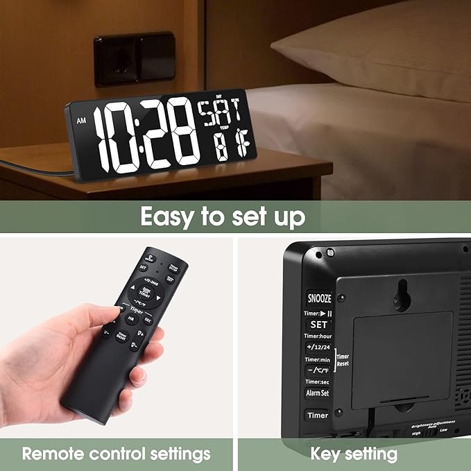 - Wall clock / desk clock with pluggable power supply: Corded Electric LED clock can be placed on the desktop or hung on the wall. Easy set .Set up on the device or easily through the buttons on the remote control. Multi-functional large-scale digital LED alarm clock / wall clock, which is very convenient for our life.