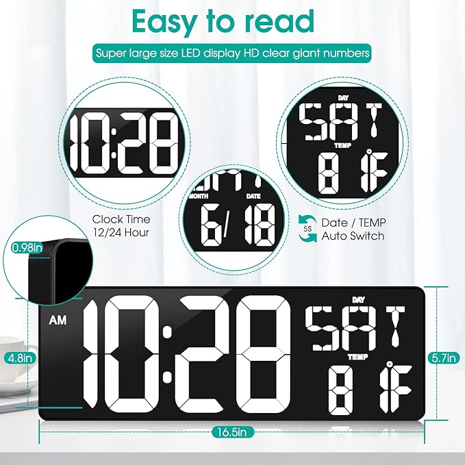 - Large screen 4 gear brightness adjustment: The large 16.5-inch screen and Big numbers,Easy to Read screen,4 level- Remote control adjusts brightness.Comfortable visual experience.It's very comfortable to watch time during the day, and it won't affect rest at night.