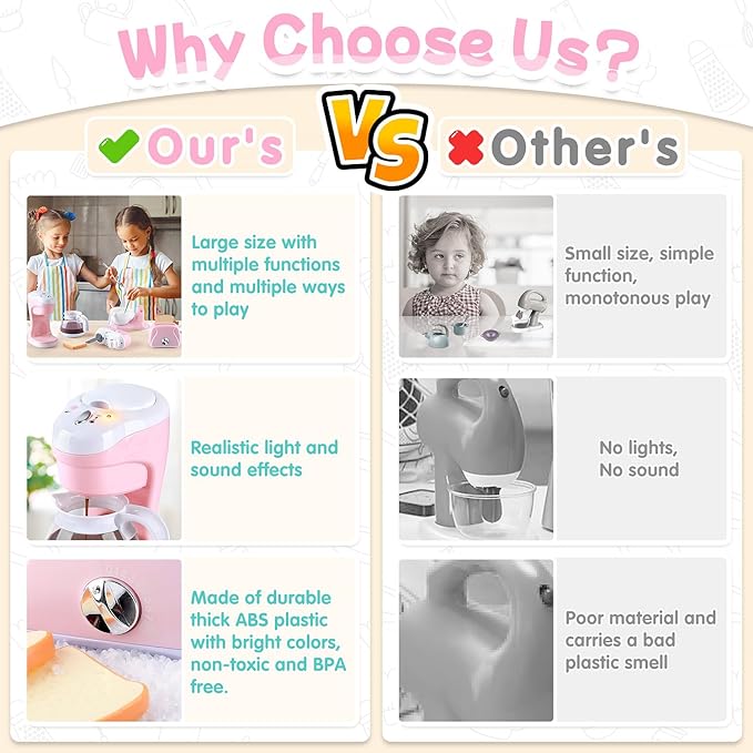 • High-fidelity play kitchen accessories for kids:cocinas de niñas including a pretend toy coffee maker for kids, a toy mixer, and a toy toaster, which can be used to accompany children to spend a happy parent-child time, guide children to make afternoon tea by themselves, and your children can make Coffee and make delicious cookies with you. improve children's hands-on ability, and cultivate children's interest.