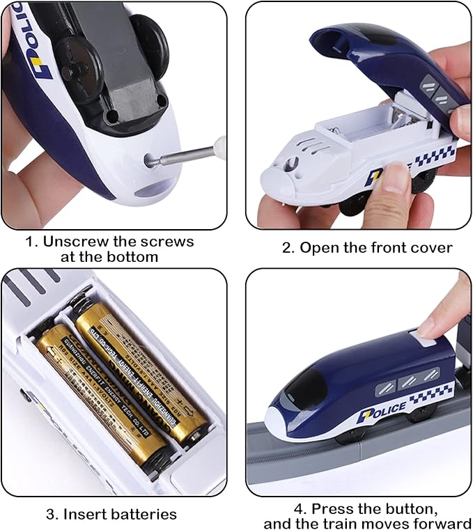 - RECOMMENDATION AGE: The railway vehicle toy set is suitable for ages 3 year old,4 year old boy and girl. This cute blue police topic train set is perfect for toddlers and will inspire hours of imaginative play. Install the battery, press the switch, and the train will move forward immediately with real and lively track sounds, it will catch babies' eyes