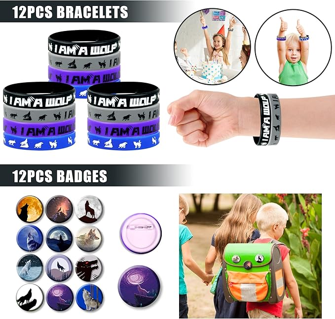 48 PCS Wolf Party Favors, Wolf Birthday Party Favors with 12 Wolf Button Pins, 12 Mini Notebooks, 12 Stampers and 12 Rubber Bracelets for Birthday Party Baby Shower Holiday