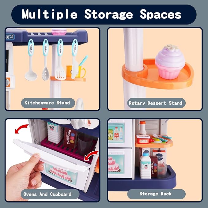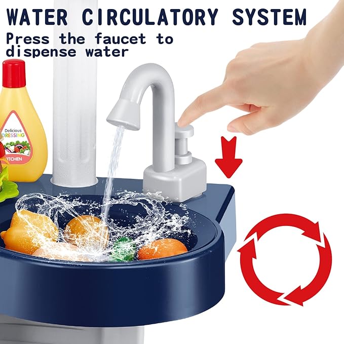 - 【Water Saving Design】Just add the water to the sink and then manually press the faucet button and water will come out. It without repeatedly adding water and wasting water. Kids can wash food or tableware in the play sink. The extra large storage space and dish rack make storage easier.